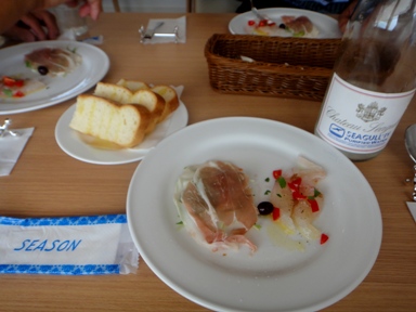 生ハムと魚の前菜とホカッチャです。瓶は水。ドリンクはチシリアオレンジです。そしてフレンチドレッシングのサラダ。