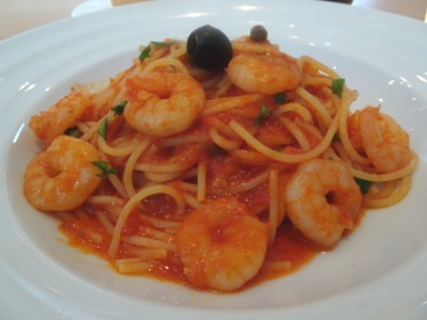 今回はBデザートランチ(1250円税込)を注文。パスタは小海老のブッタネスカとドリンクはアイスコーヒーを選んだ。
