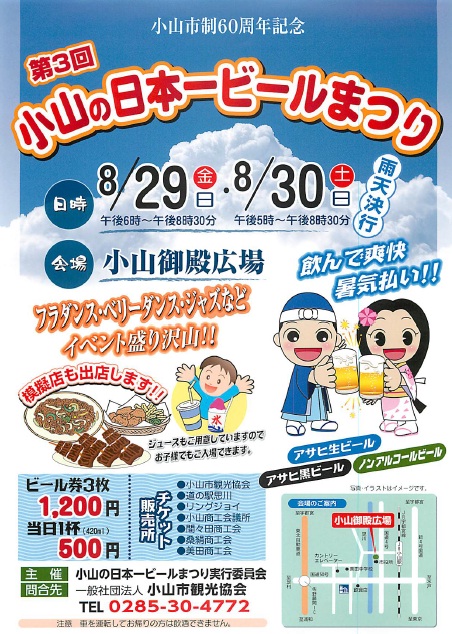 会場は小山御殿広場(市役所の横)です。8月29日はPM6:00〜PM8:30。8月30日はPM5:00〜PM8:30。