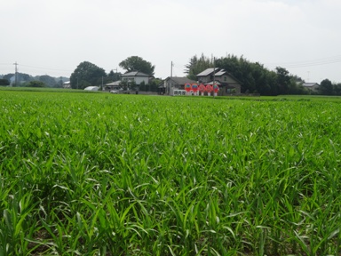 畑ばかりで緑が綺麗です(笑) はるか遠くに赤い物が見える? あそこかな? 近づいて見ると開店の花輪でした。