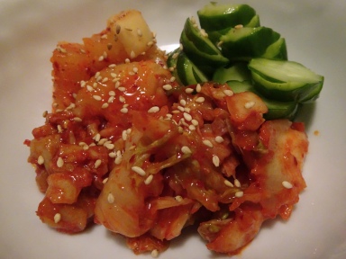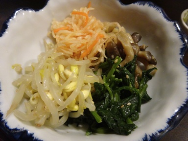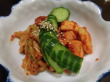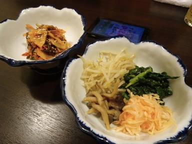 皿が大きくアッキーナが「重い」と言いながら持っていた。自家製キムチ↑(450円) ナムル盛り合わせ↑(500円)