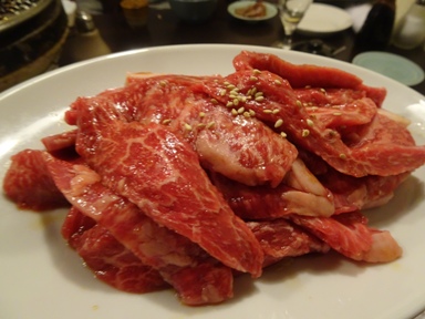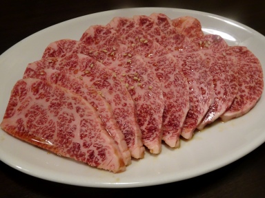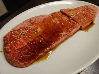 ミスジ↑(1600円)は牛肩部分の赤身肉です。一頭からとれる量が少なく焼肉店ではあまり見ません。私も料亭で