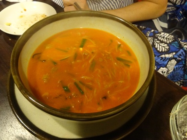カルビスープ↑(690円)は大き目でシェアしてもOK。チャージ料金は300円ですがドリンクバーが無料になります。