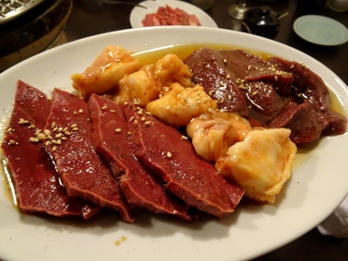 人気商品の和牛切り落とし↑(590円×2人前)は確かに美味しい。ホルモン盛り↑(1000円)の内容は日替わり。