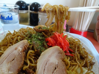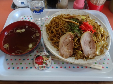 肉入りやきそば↑(500円)を注文。やきそばの上にチャーシューとメンマがのってた。少し甘めだけど美味しかった。