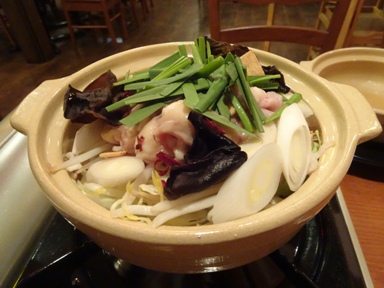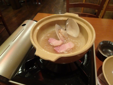 お通し(300円)はホタテとベーコンの煮物。お通しなのになんか得した気分。鍋も3種類あってみんな美味しそう。