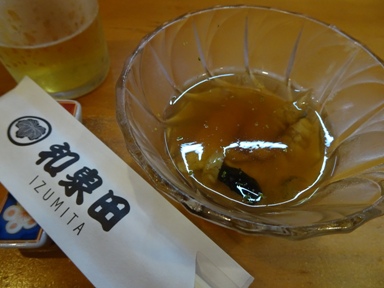 夏の日差しで店のまわりの稲が綺麗な緑色をしてた。今回も店主のおすすめです。まずはトラフグの煮凝り初体験。