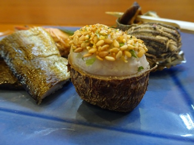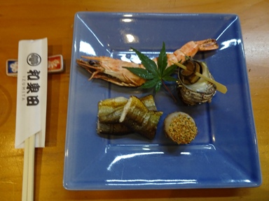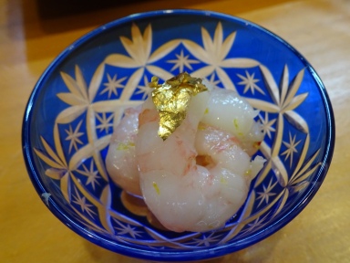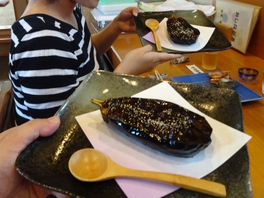 里芋で驚いた次にまたまた初体験の甘海老の塩辛。高知茄子の田楽は茄子が大きい。甘めの自家製味噌も力作。