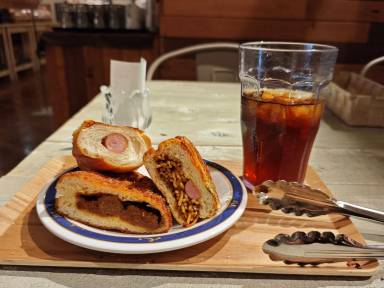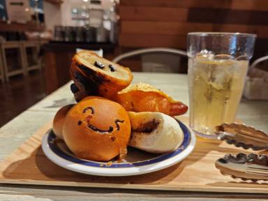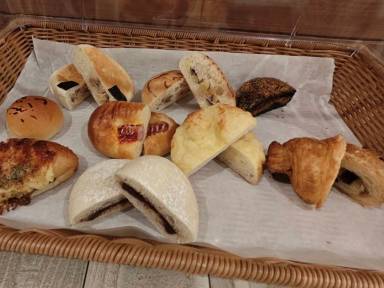 自分でトースターで温めて食べます。甘いパンだけでなく総菜系も充実していました。ソフトドリンクも飲み放題でした。