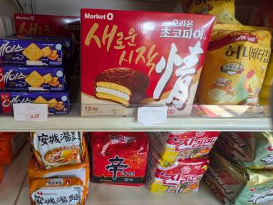 店内の棚には、胡麻油、韓国のり、スナック菓子、ひまわりの種チョコレート、お茶、など韓国製品がギッシリあった。