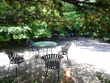 爽やかな風が吹き緑が豊富なので暑くないテラス席。雨や直射日光を避けられて一番人気だと思われる軒下席。