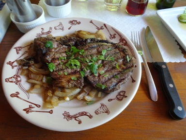 多量のタマネギの上に乗るステーキは300gあると思います。薪の香りのするステーキは税込み4600円でした。