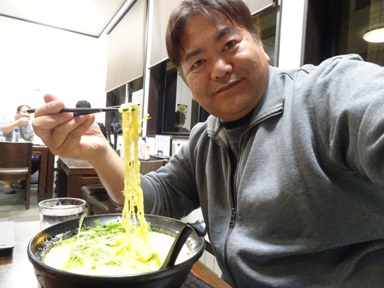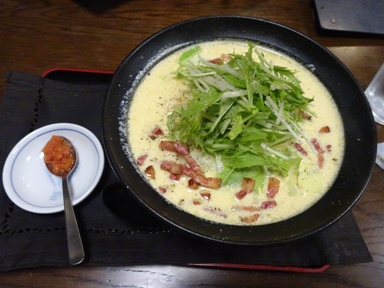 カルボナーラー麺↑(950円)です。これは地元の卵を使ったパスタとラーメンの合体料理。新しい発想で良いね。
