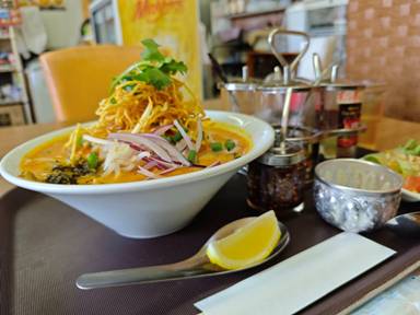 朝からラーメン気分だったのでカオソーイ↑(900円)を注文。揚げ麺と湯で麺の入ったタイのカレーラーメンです。