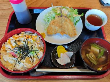 この店は良心的な価格の家庭料理が有名です。日替わりランチは、玉子丼とアジフライ定食↑(750円)でした。