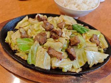 鉄板焼1.5人前(1300円)+ライス大盛り(300円)を注文しました。見た目は普通だけど、これは初めての味ですね。