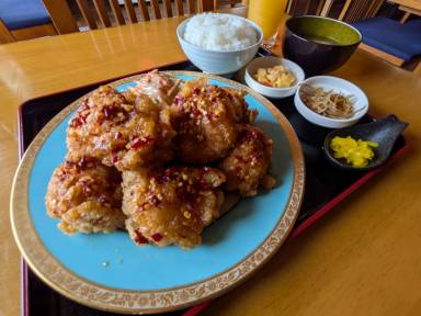ランチのユーリンチー定食↑(1200円)を食べたら大きな唐揚げが8個も入っていた。他のメニューも気になるね。
