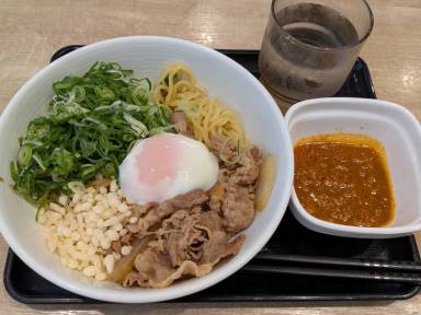 吉野家125年の歴史で初めて麺料理が発売されました。牛玉スタミナまぜそば↑(767円)です。ニンニクたれ付き。