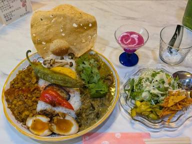久しぶりの訪問ですが、前回美味しかったスパイスカレー2種盛↑(1200円)を注文。内容は違ったが美味しかった。