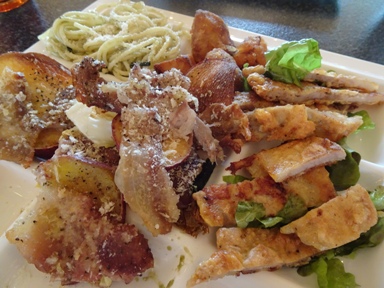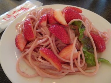 見た目は微妙だけど苺の冷製スパゲティ↑は実は美味しい。やんちゃ豚の鉄板焼き↑は豚本来の味が楽しめます。