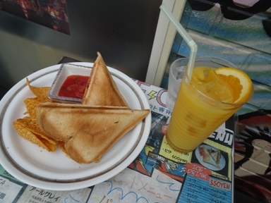 ロックスの前にベンチが増設された。思わず座ってみた。店頭で食べられるホットサンドセット(800円)を注文した。