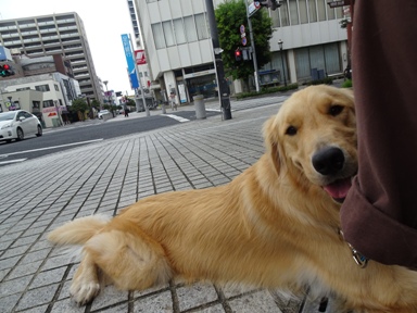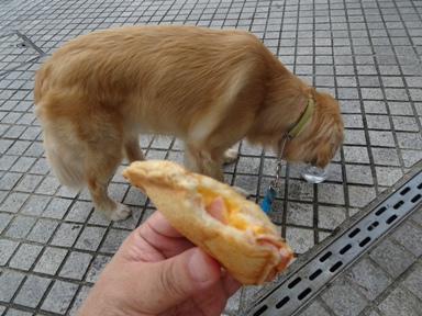 中身はハムエッグで美味い。相棒は店から水を頂いて上機嫌。なぜか信号待ちの女子が何人も相棒を触りに来るw