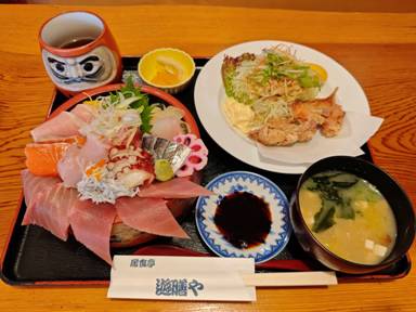海鮮丼&自慢の唐揚げセッロ↑(2580円)を注文。具沢山の海鮮丼はリッチな気分になれる。唐揚げも絶品です。