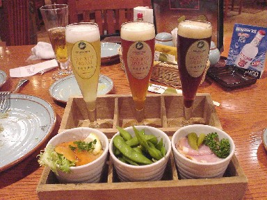 地ビール3種類+おつまみ3種類セット↑(1000円)は激安だと思います。とりあえずこれで本日の目的終了です。