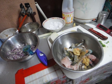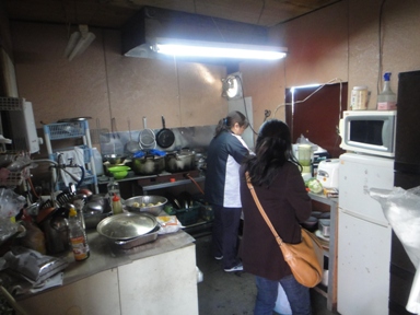 料理は、いかにも?って感じのキッチンで作られます。見学自由です。今回は炒め物と揚げ物を注文してみました。