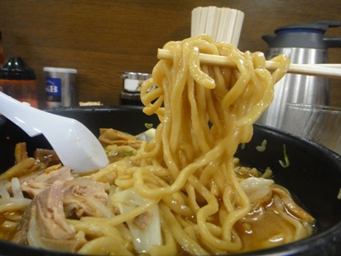 たぶん豚肉と鶏をねり込んだスープだと思いますが濃厚なコクと旨味がしっかり出ています。極太麺に良く合います。