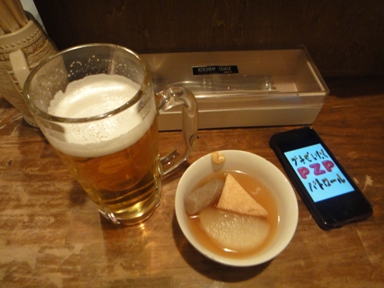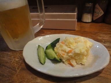 店内はカウンターのみ。ここの屋台村自体大きい店はありません。お通しは普通のポテトサラダ&キューリでした。