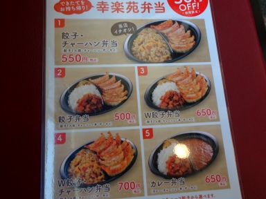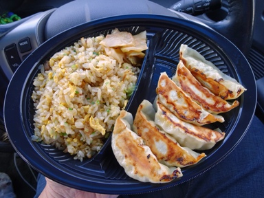 テイクアウトの餃子・チャーハン弁当↑(550円)を購入して車内で食べた。いつもの幸楽苑の味なので安心できる。